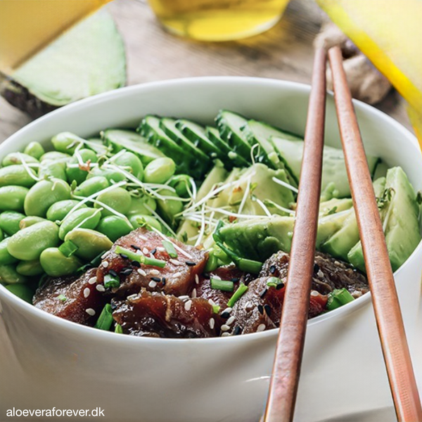 Ahi tun, edamame og avocado m. ingefær og sesam dressing