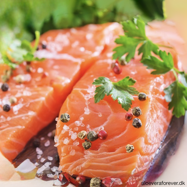 Skær laksen i 4 fileter på 85 g pr. stykke. Forvarm ovnen til 200 gr. varmluft eller brug en grill. Pensl laksestykkerne med 1 finthakket hvidløg og citronsaft. Grill eller bag laksen i 10 minutter.