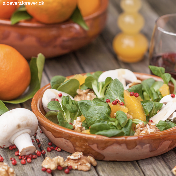 Skyl salaten. Bland det hakkede løg, balsamicoeddike, olivenolie og hvidløg til en vinaigrette. Du kan også sautere løg og hvidløg i olivenolie på forhånd. Smag saucen til med salt, peber og evt. andre krydderier. Skræl hele appelsinen og skær den i dekorative skiver. Kog 200 ml appelsinjuice ned til cirka 1/3 af den oprindelige mængde. Skær svampene i kvarte og steg dem på en pande med smør og lidt olie, tilsæt salt og peber.