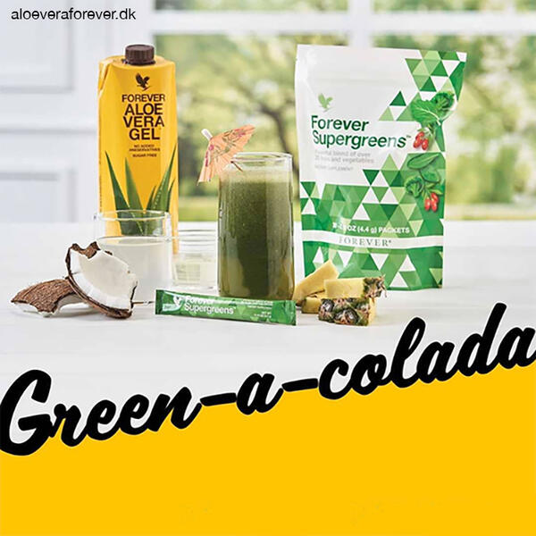Blend kokosvand, Forever Aloe Vera Gel, Forever Supergreens og ananasstykker til en passende flydende konsistens. Hæld lidt Forever Bee Honey ud på en tallerken og dyp kanten af to høje glas i honningen. Dyp derefter kanten i fint kokosmel.