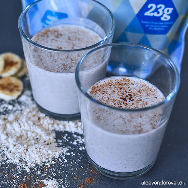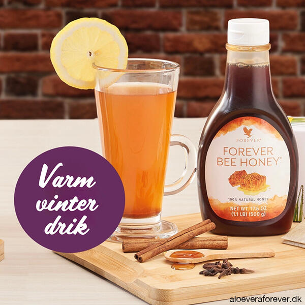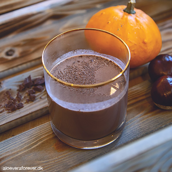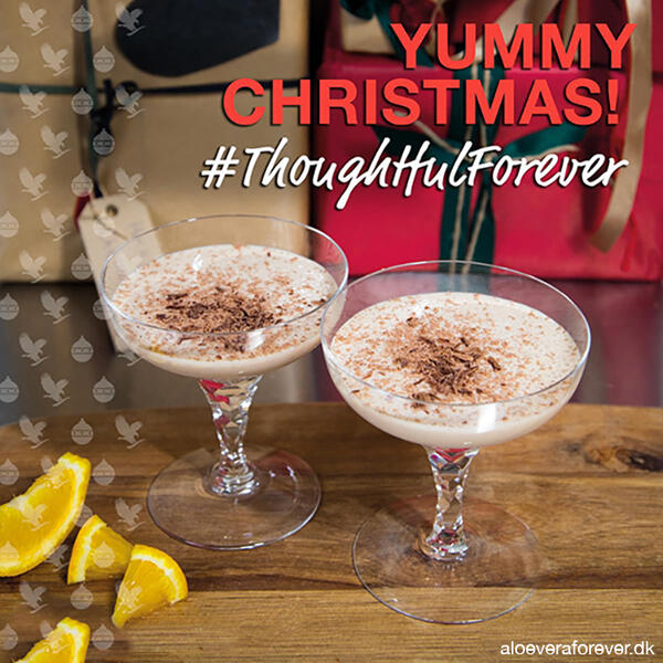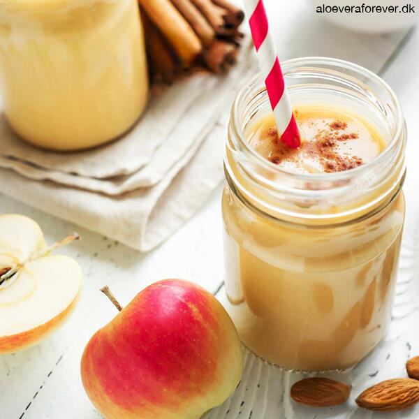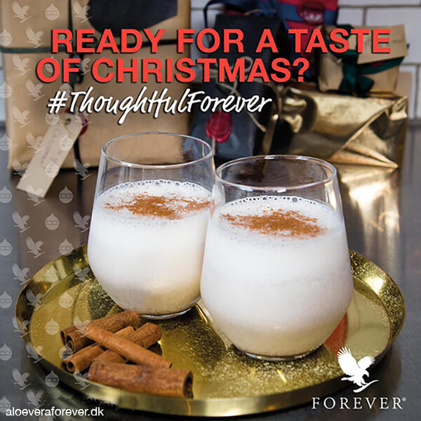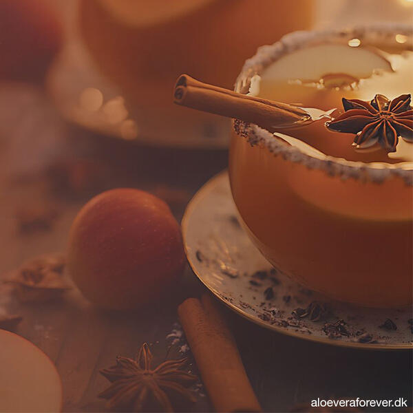 60 ml Forever Aloe Vera GelAlle dele blandes og anrettes i to glas med en kanelstang og en stjerneanis i hvert glas. Kan nydes opvarmet eller kold.