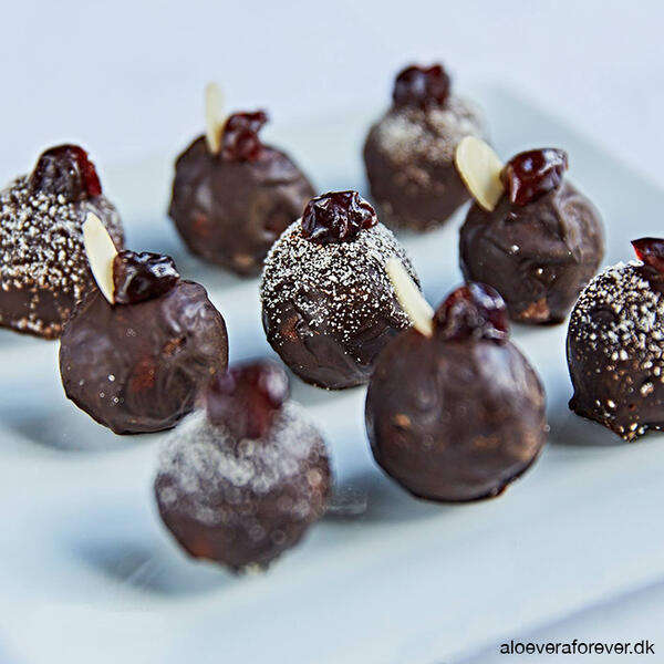 Blend alle ingredienser undtagen chokoladen og 6 kirsebær, indtil massen er jævn. Form 12 små trøffelkugler af massen. Skær de 6 kirsebær i halve. Smelt chokoladen i vandbad, og - ved hjælp af to skeer - overtræk forsigtigt hver trøffelkugle med et tyndt lag chokolade, før de sættes på bagepapir. Drys evt. med lidt fint kokosnød og tryk et halvt kirsebær fast på hver trøffelkugle, mens chokoladen stadig ikke er stivnet. Du kan evt. også stikke en tynd mandelflage ned ved siden af det halve kirsebær. Sæt trøflerne på køl i en time.
