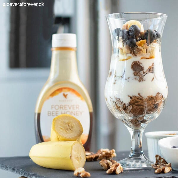 Læg yoghurt, bran flakes, bananskiver, blåbær og Forever™ Bee Honey i lag i et passende glas og top med valnødder og kanel efter smag.